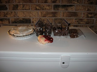 I’ve tested each food so to allow me to write a proper thank you and let them know how wonderful the food was. I took bites of each with the exception of the items with chocolate and peanut butter… I’ve had more than I probably needed of them on Sunday and some more yesterday. Then last night I packaged up about two thirds of it and put it in the deep freezer. If you look closely at the chocolate cream pie you’ll see my one bite taken out. LOL