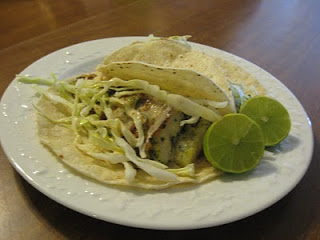 My plate held two corn tortillas with 2 oz. of fish in each, less than 1 oz. of shredded cabbage, approx 2 tsp. crema (one on each) and the juice from two key limes. This is a salad plate, so it looks fuller. It was approximately 275-300 calories for both. And so good (and low-cal) I ended up having just one more…