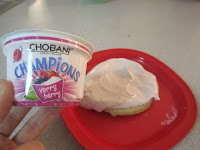 A whole wheat waffle with a kids size Chobani greek yogurt on top. (Thanks to Jillian Michaels for that food combination idea.)