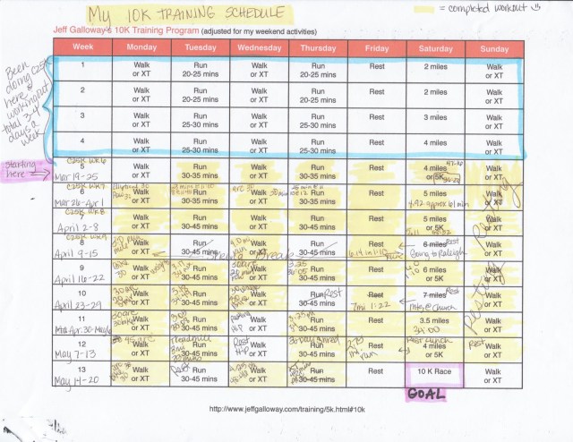 Then I searched online for a training plan that went well with my running experience so far (very much “new runner”). I chose Jeff Galloway’s 10K Training Program and it has served me well. I copied the above chart after the one on his website, switching my rest day to Fridays and Sundays and doing the long runs on Saturdays.