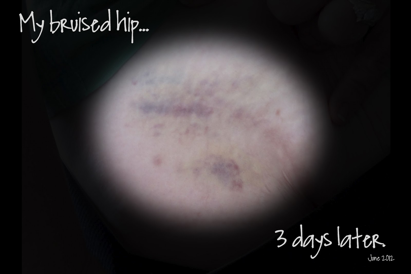 Sunday morning in the shower I found the bruise on my hip that looked much, much worse than today’s picture. I didn’t know whether to laugh or cry at the idea that I injured myself while trying to massage with the foam roller.