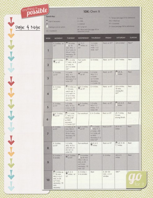 This week I’ve begun a 10K training plan in preparation for a race I’d like to do in May.  I’m starting a few weeks early because (A) I’m excited to get started and (B) I know for sure there’s one week I most likely won’t get running in due to a short trip.