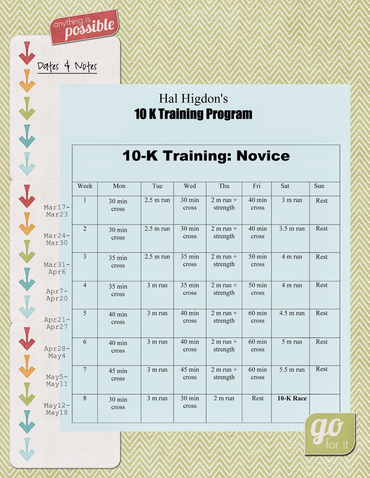 This is my daughter’s first 10K race, so I looked around for a beginner training plan that I thought would work for her. I like how basic Hal Higdon’s plan was for someone who was new to running in general. So, we are both following his 10K Novice Training Program.
