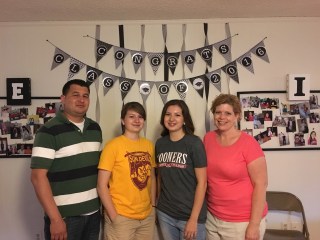 | My husband and I with our kids — sporting the shirts where they will be attending college. |